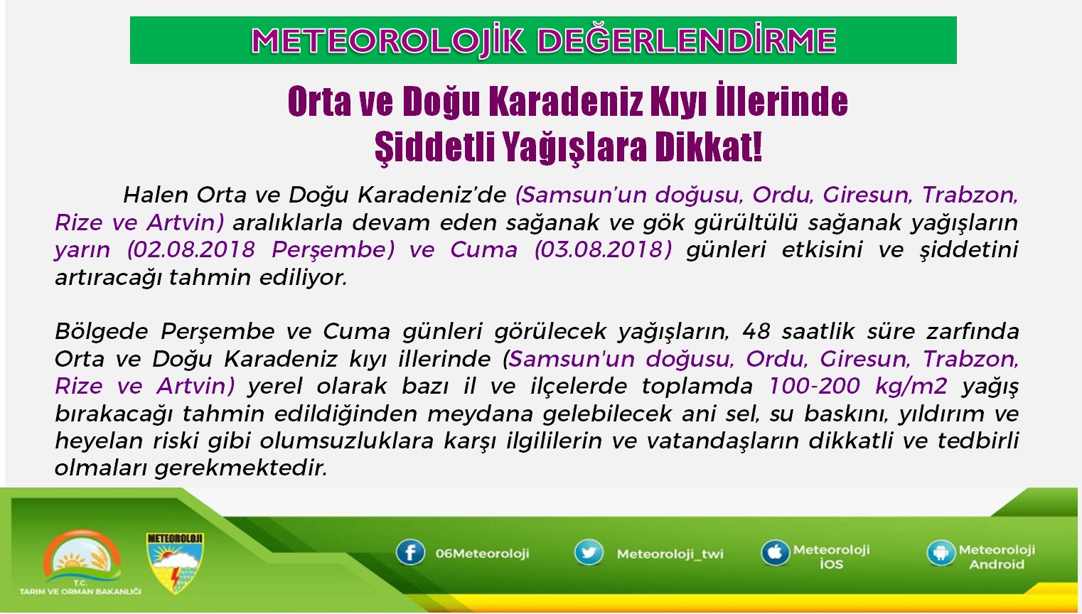meteoroloji mgm a twitter meteorolojik degerlendirme samsun un dogusu ordu giresun trabzon rize ve artvin de persembe 02 08 2018 ve cuma 03 08 2018 gunu beklenen yagislarin kuvvetli ve yer yer siddetli olmasi bekleniyor https